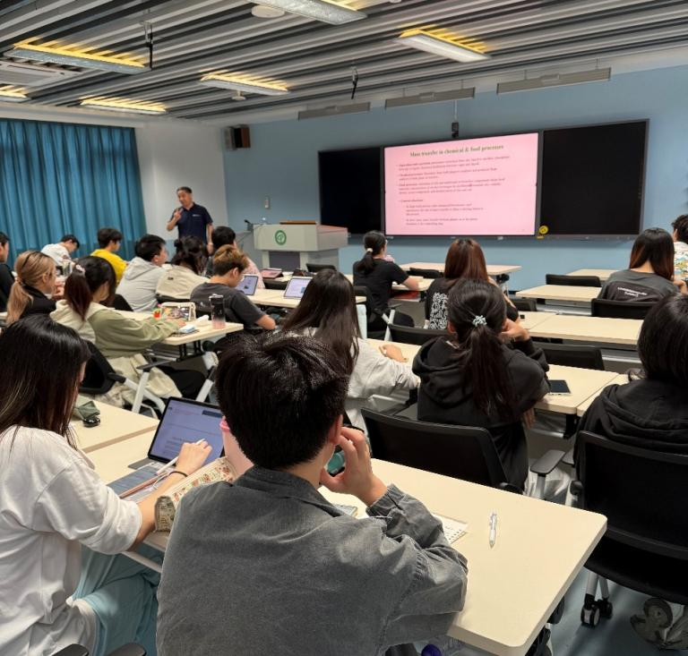 在《食品工艺学》课程讲授中,吴教授结合生动的例子,向学生们详细阐述了发酵、加热等一系列食品工艺生产中涉及的物理化学原理及相关计算方法。课堂上,吴教授注重与学生的实时互动,耐心讲解所涉及的复杂数学公式,并鼓励学生用英文交流,氛围十分融洽。