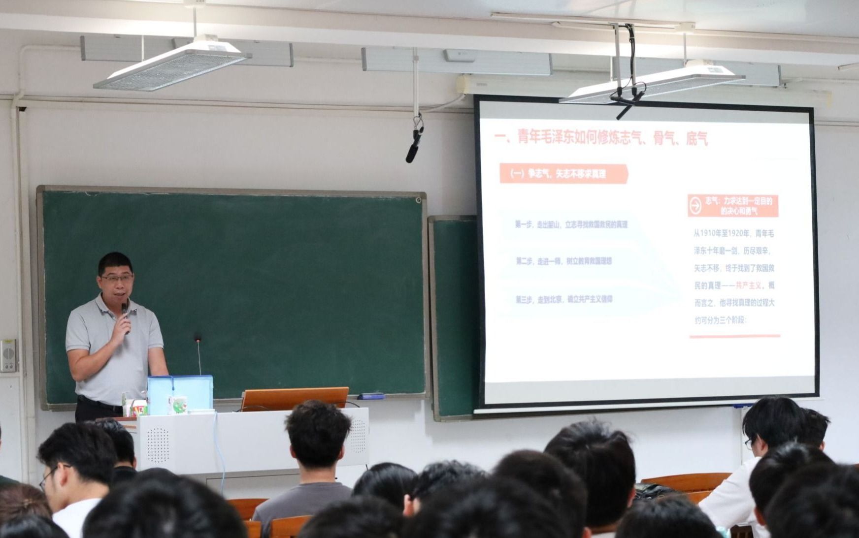 10月17日下午,谢炯标以“青年毛泽东的成长经历与启示”为题,与2022食品质量与安全1班,2022应用化学1班、2班全体同学进行了交流。他从“强志气”“硬骨气”“蕴底气”三个方面阐述青年毛泽东的理想信念及远大志向,回顾其不畏强权、敢于斗争的人生历程,并向同学们讲述当代青年承前启后、继往开来的历史使命,勉励大家应摒弃社会不良因素影响,磨练坚强意志与强大体魄,重视知识积累,积极探索实践,勇敢肩负起时代赋予的重任,接过“接力棒”,当好“传承人”。最后,他以《沁园春·长沙》一词勉励同学们学习伟人心胸与气象,要以高远志气立心,以浩然骨气立命,以深厚底气立业,做有理想、敢担当、能吃苦、肯奋斗的新时代好青年。