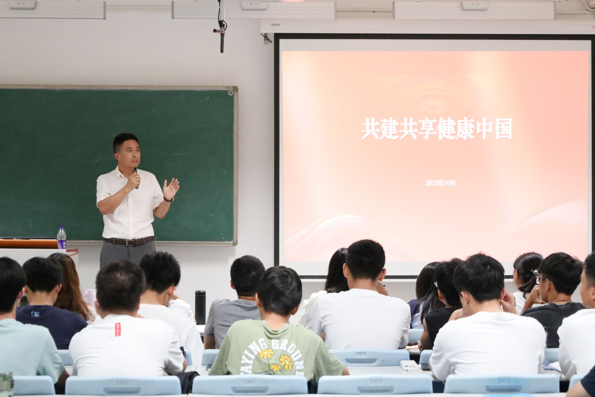 10月18日晚,王际辉以“共建共享健康中国”为题,对2023食品质量与安全1班,2023食品科学与工程1班,2023应用化学(药学联合班)全体同学授课。他以当前我国面临的复杂健康环境作为切入点,向同学们指出了建设健康中国、实施健康中国战略的重要意义,点明了当代青年应当肩负的社会责任。他结合当前快速发展的健康产业,从“四个链条”阐述大健康理念,号召同学们主动反思自身生活方式,自觉抵制不良习惯,积极学习健康知识,践行健康的生活方式和行为,做自己健康的第一责任人。同时,他引用权威刊物研究成果及相关调查数据,以通俗易懂的方式说明健康膳食、情绪稳定的必要性,鼓励同学们坚持健康运动习惯,提高生命质量。