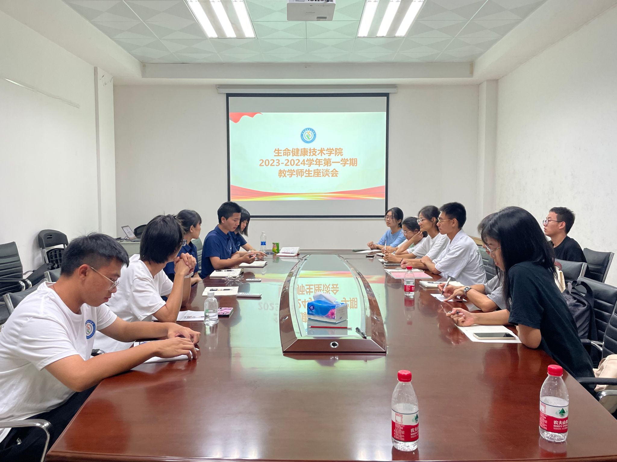 会议室召开本学期师生座谈会。生物医学工程系主任王笛、营养与健康系副主任陈璇、青年教师代表刘梦和王梅梅与麻豆传媒